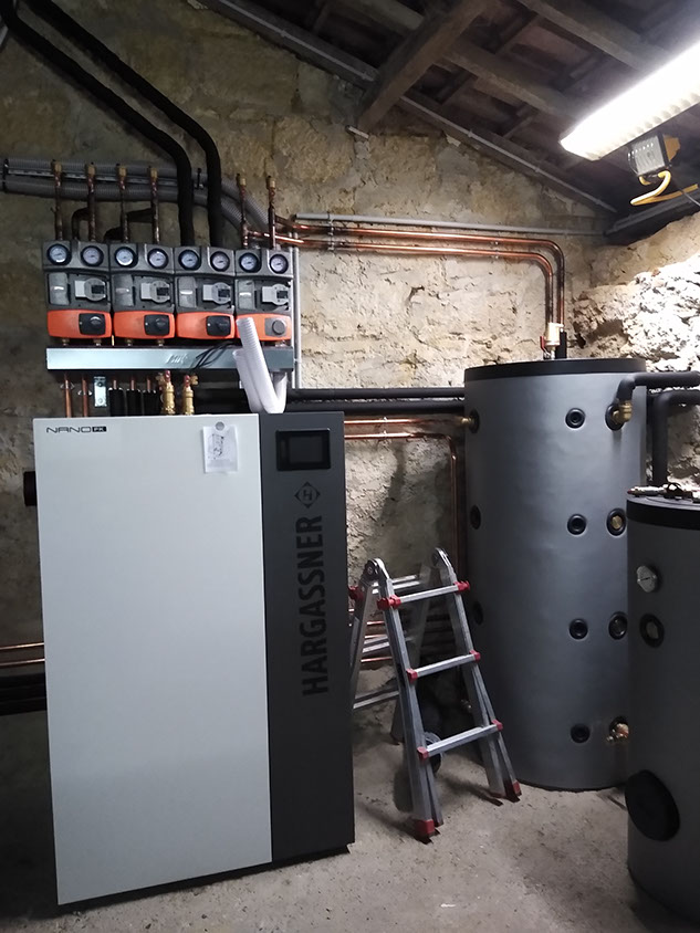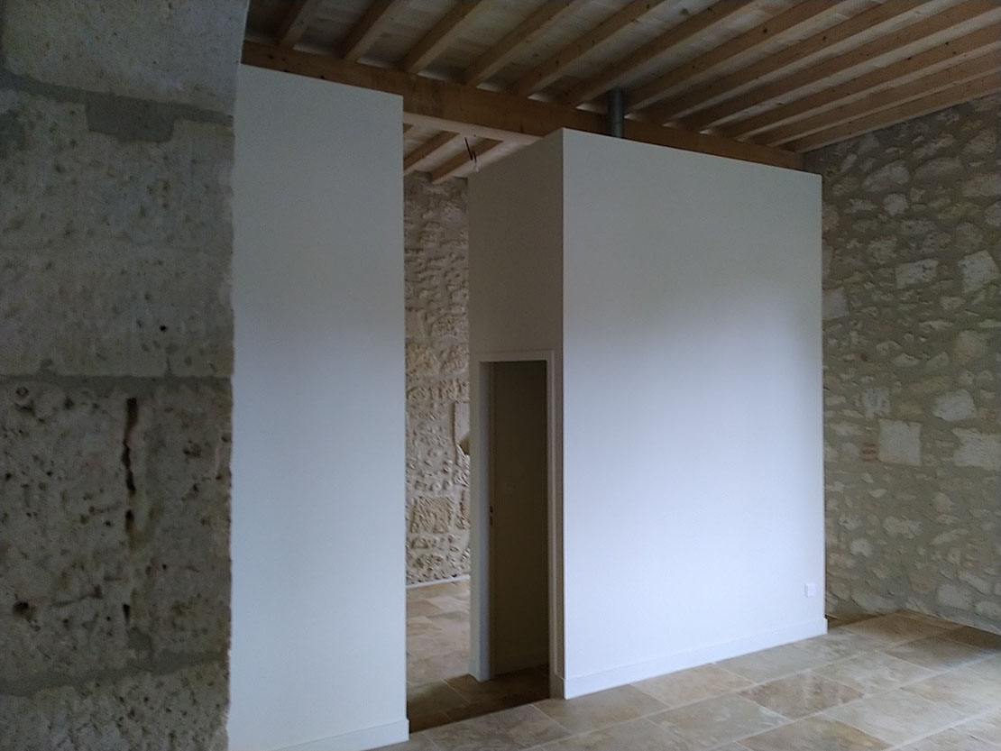 Le projet de Madame K. consiste à retrouver le bâtiment comme à son origine, en supprimant les traces des années 1960 durant lesquelles les volumes ont été découpés et réduits. Très orientée vers les démarches écologiques et qualitatives, Madame K. a souhaité travailler avec des matériaux nobles (le bois, la pierre) et a choisi un chauffage par le sol alimenté par une chaudière à granulés bois.