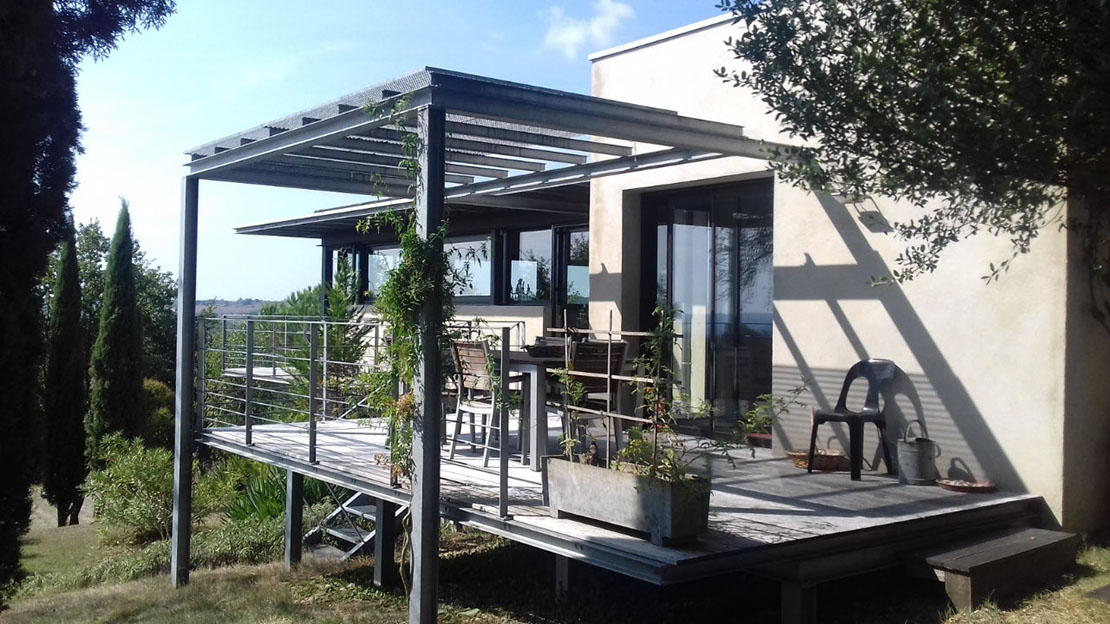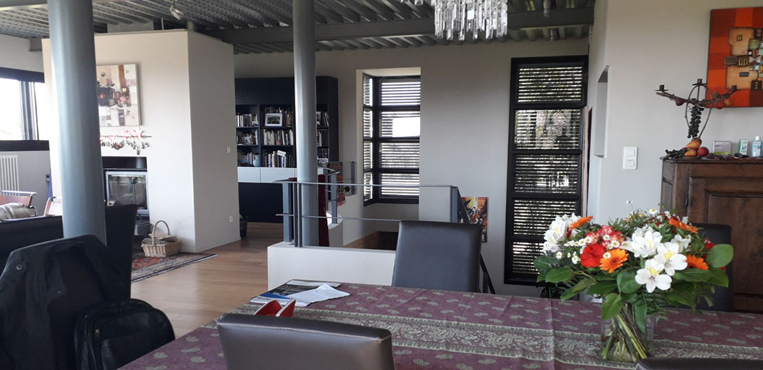 Les espaces jours sont situés en rez-de-chaussée accessible au niveau de l’accès véhicules alors que les espaces nuit sont situés en rez-de-jardin. L’espace de liaison est ouvert et assure la continuité spatiale entre les deux niveaux. Largement ouverte au Sud-Est sur le jardin et au Sud-Ouest sur le grand paysage, la maison bénéficie de vues jusqu’aux Pyrénées.