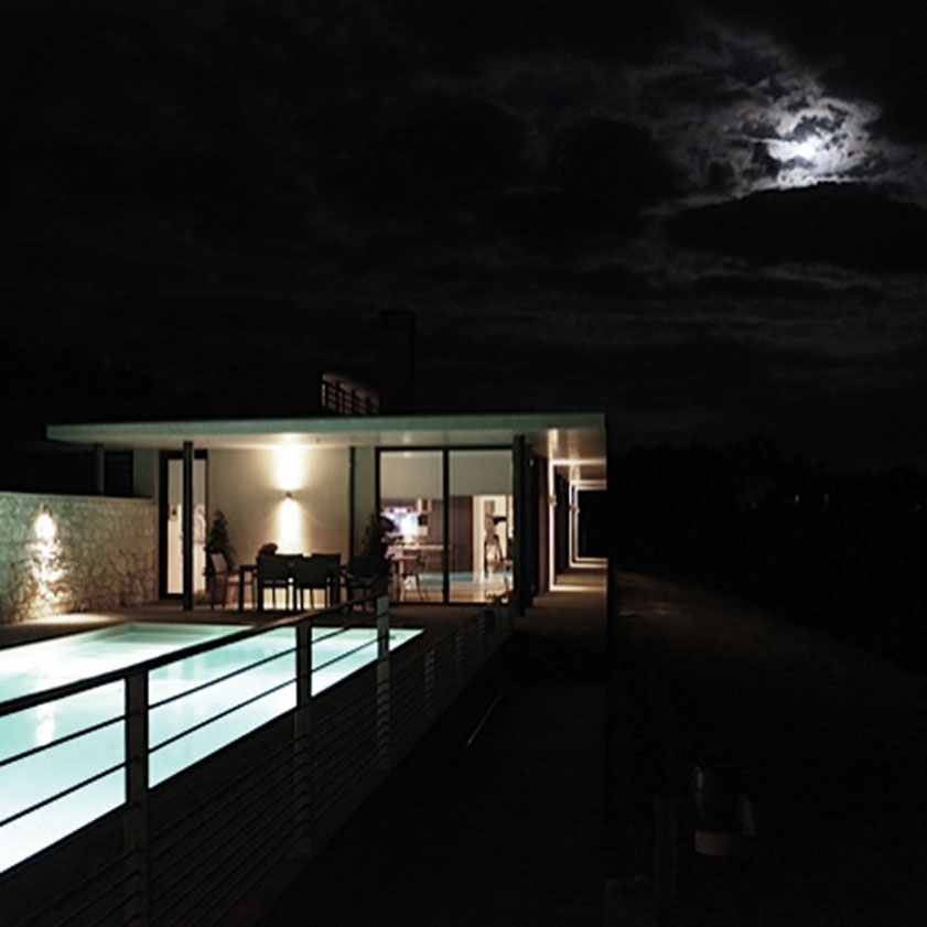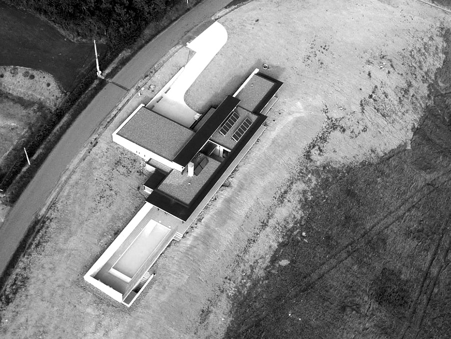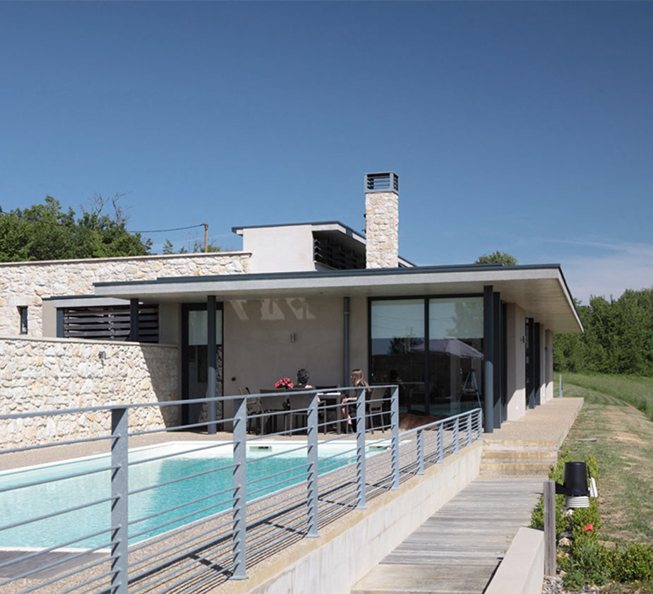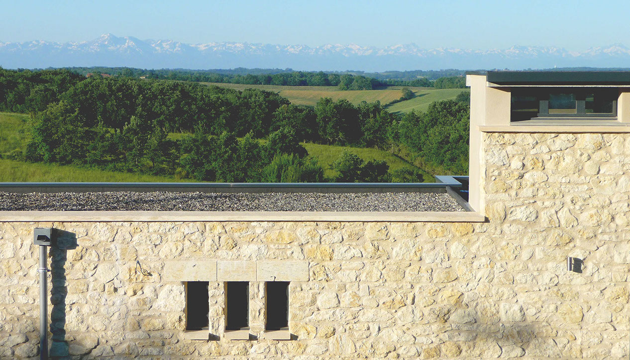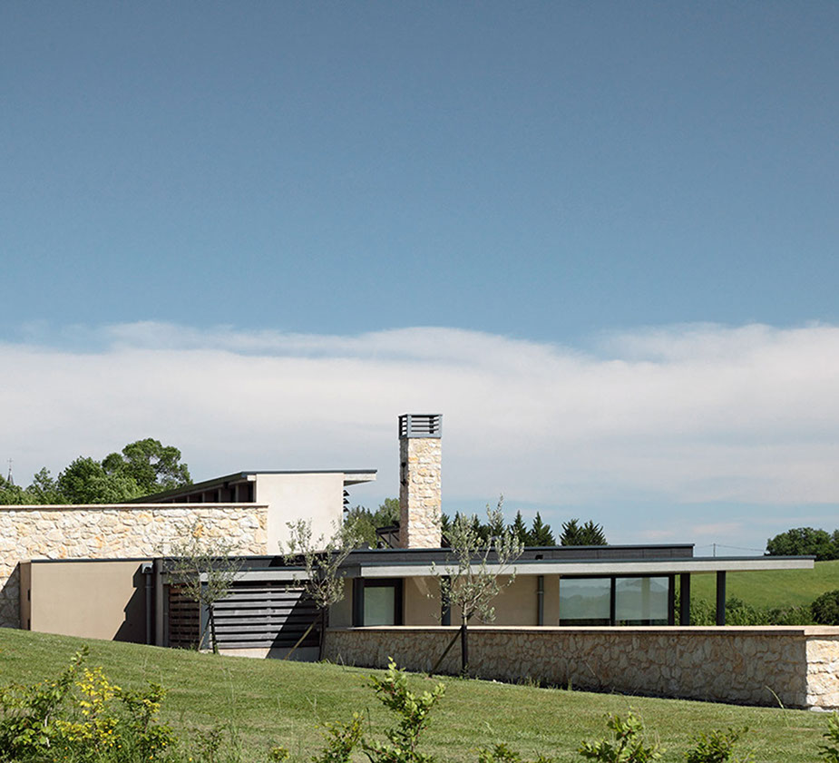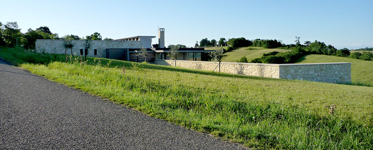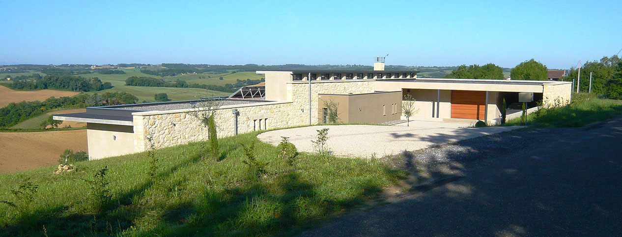 Cette maison individuelle s’inscrit dans un site de grande qualité paysagère. Le terrain, situé à l’Ouest du village, à flanc de coteau, bénéficie de très belles vues dégagées sur le « grand paysage », les Pyrénées. Le programme comprend une maison d’habitation type 4 avec deux garages et une piscine. Le Maître d’Ouvrage souhaitait une architecture contemporaine discrète, respectueuse du site et s’inscrivant dans une démarche de développement durable (choix de matériaux locaux, utilisation d’énergies renouvelables…).