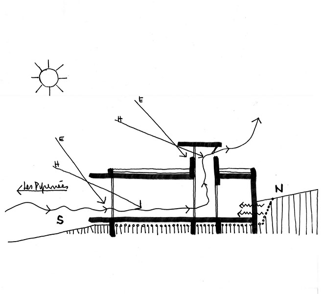 La configuration des lieux et les orientations exprimées par le maître d’ouvrage nous ont conduits à développer un parti architectural linéaire parallèle aux courbes de niveaux, composé de volumes simples et bas à toitures plates facilitant l’inscription du projet dans ce paysage majestueux et fragile.