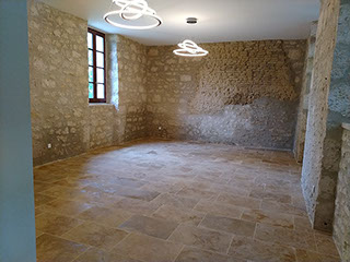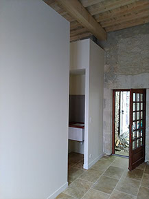 Le projet de Madame K. consiste à retrouver le bâtiment comme à son origine, en supprimant les traces des années 1960 durant lesquelles les volumes ont été découpés et réduits. Très orientée vers les démarches écologiques et qualitatives, Madame K. a souhaité travailler avec des matériaux nobles (le bois, la pierre) et a choisi un chauffage par le sol alimenté par une chaudière à granulés bois.