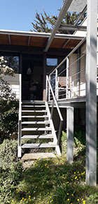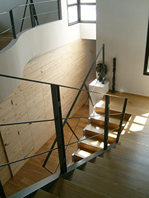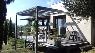 Les espaces jours sont situés en rez-de-chaussée accessible au niveau de l’accès véhicules alors que les espaces nuit sont situés en rez-de-jardin. L’espace de liaison est ouvert et assure la continuité spatiale entre les deux niveaux. Largement ouverte au Sud-Est sur le jardin et au Sud-Ouest sur le grand paysage, la maison bénéficie de vues jusqu’aux Pyrénées.