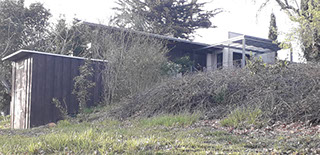 Fermée au Nord-Est (locaux techniques, abris véhicules), elle est adossée à un grand conifère protecteur au Nord-Ouest.