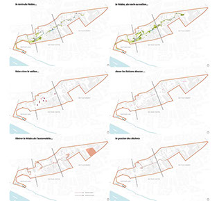 Les 3 premières phases d’études (Diagnostic multicritères, Définition des enjeux, Traduction des enjeux en éléments de programme) ont été menées conjointement par les 3 équipes urbaines (atelier architecture et territoires, Obras, D’une ville à l’autre).