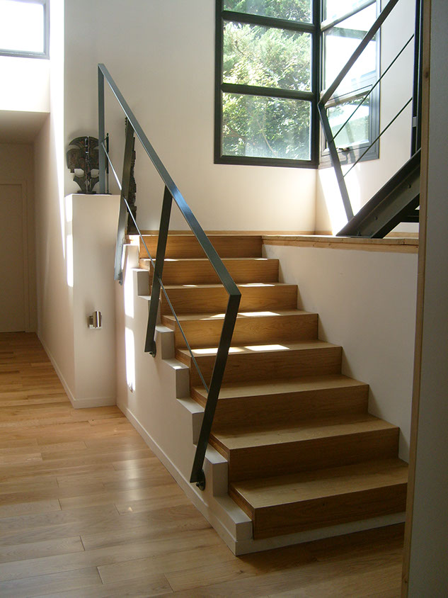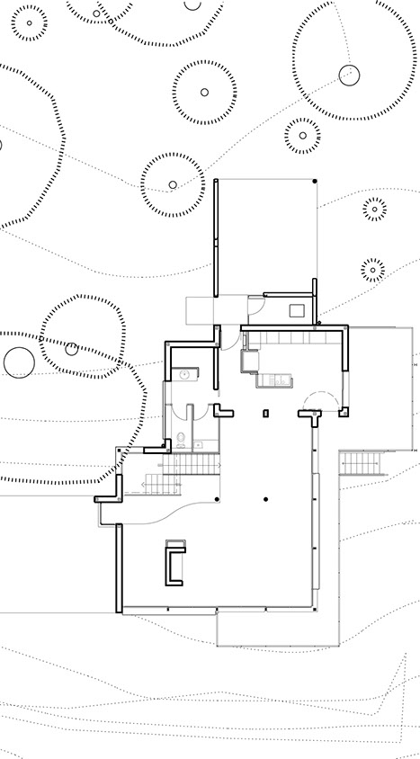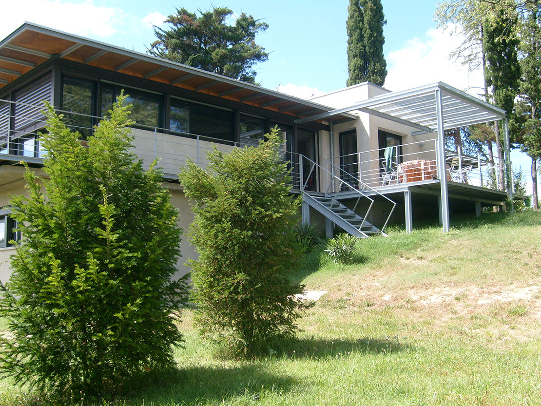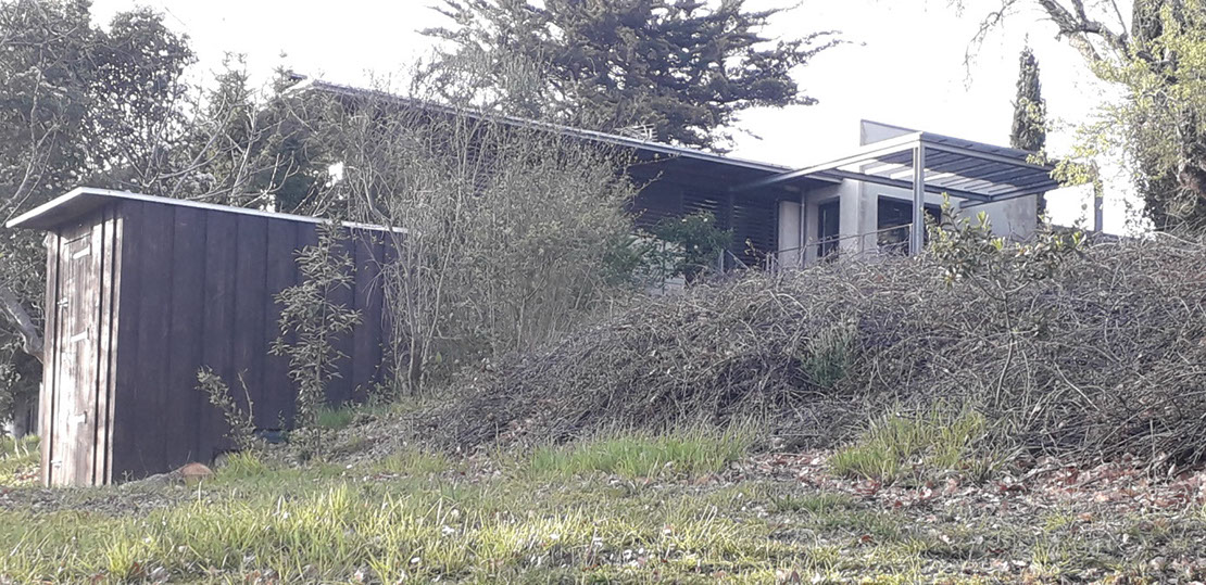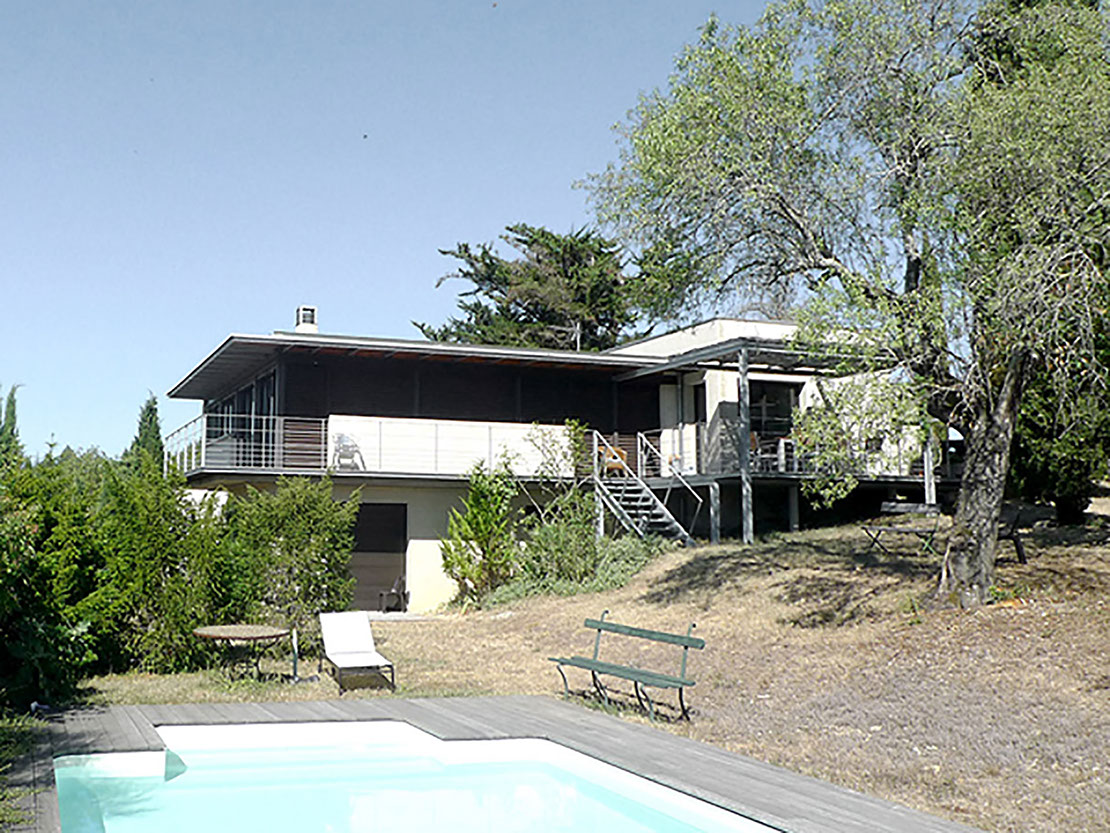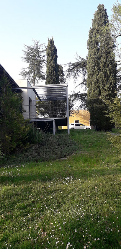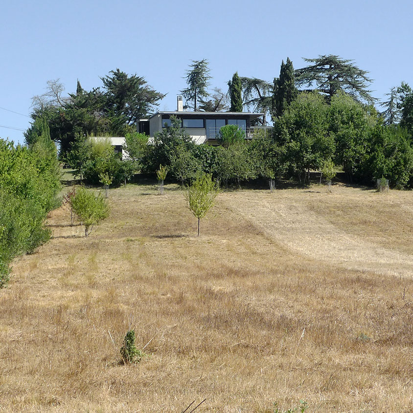 Les espaces jours sont situés en rez-de-chaussée accessible au niveau de l’accès véhicules alors que les espaces nuit sont situés en rez-de-jardin. L’espace de liaison est ouvert et assure la continuité spatiale entre les deux niveaux. Largement ouverte au Sud-Est sur le jardin et au Sud-Ouest sur le grand paysage, la maison bénéficie de vues jusqu’aux Pyrénées.
