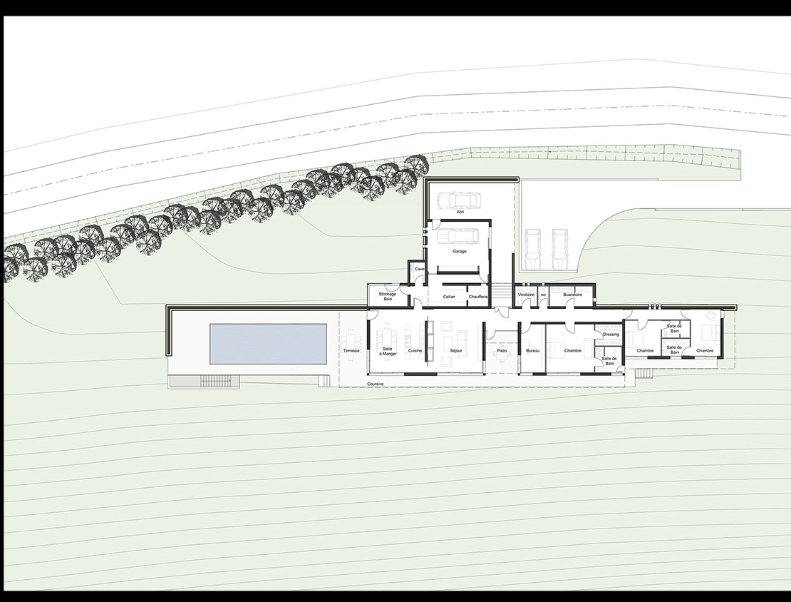 La configuration des lieux et les orientations exprimées par le maître d’ouvrage nous ont conduits à développer un parti architectural linéaire parallèle aux courbes de niveaux, composé de volumes simples et bas à toitures plates facilitant l’inscription du projet dans ce paysage majestueux et fragile.